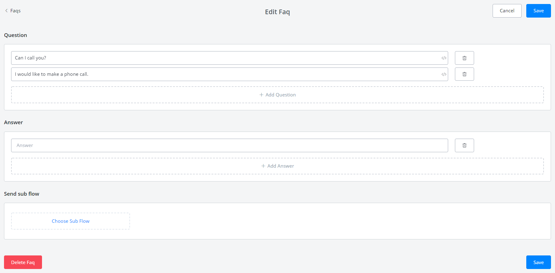 To begin with, create a FAQ in Rapidbott with only questions, no answer or sub flow.