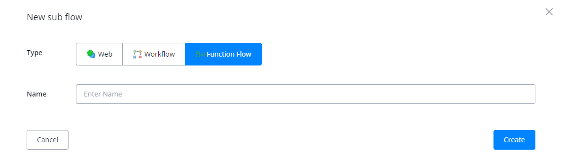 Select the **Function flow** type and name your flow. Once done press the button **Create** and you will be taken to the flow builder.