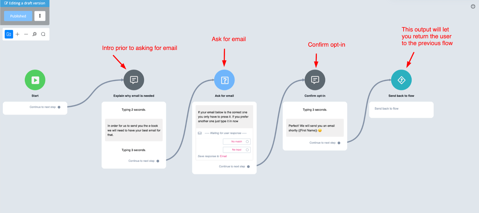After this flow is finished you can return the user to the previous flow to continue the conversation there if you like.