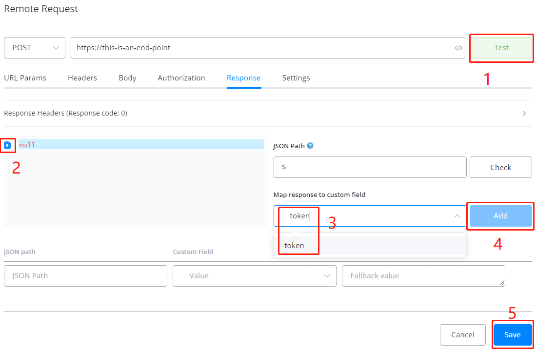 Configure the external request and click on Test, you will see the data you need in the response area. Select the token and map it back to the app by clicking the Add button. Click Save to save your auth request: