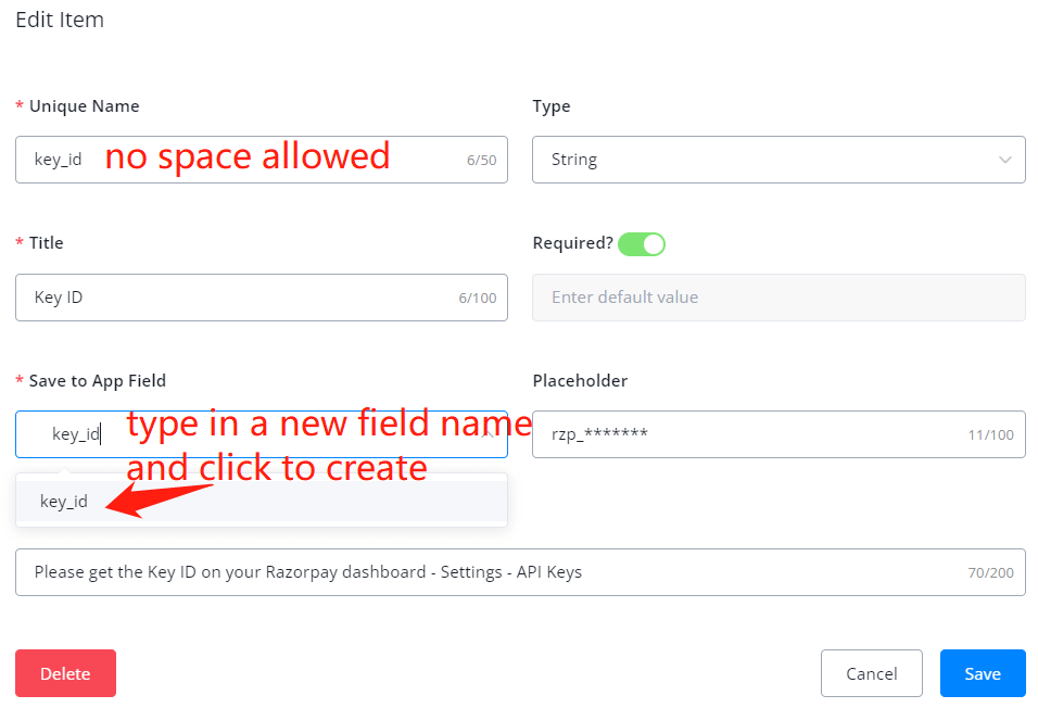 Specify where to store the value. Create a new app field right here by typing in a new field name and selecting a field type in the pop-up, or search an existing field