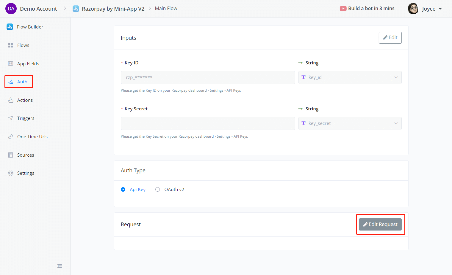 Choose Api Key in the Auth Type and click on Edit, then Add Items to add auth inputs.