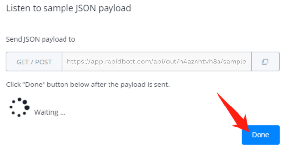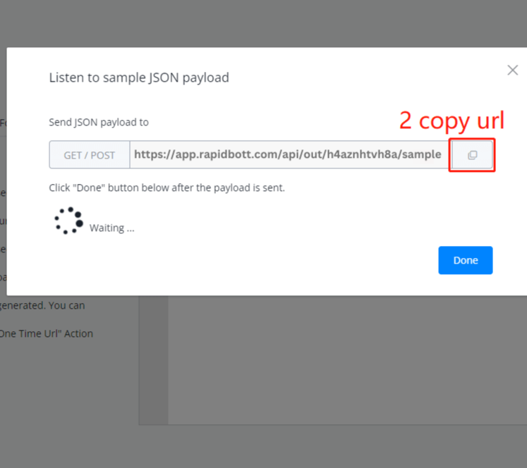 To get real-time data, click on the **Listen to data payload** button and copy the sample URL for testing. One-time URL supports both the GET and POST method.