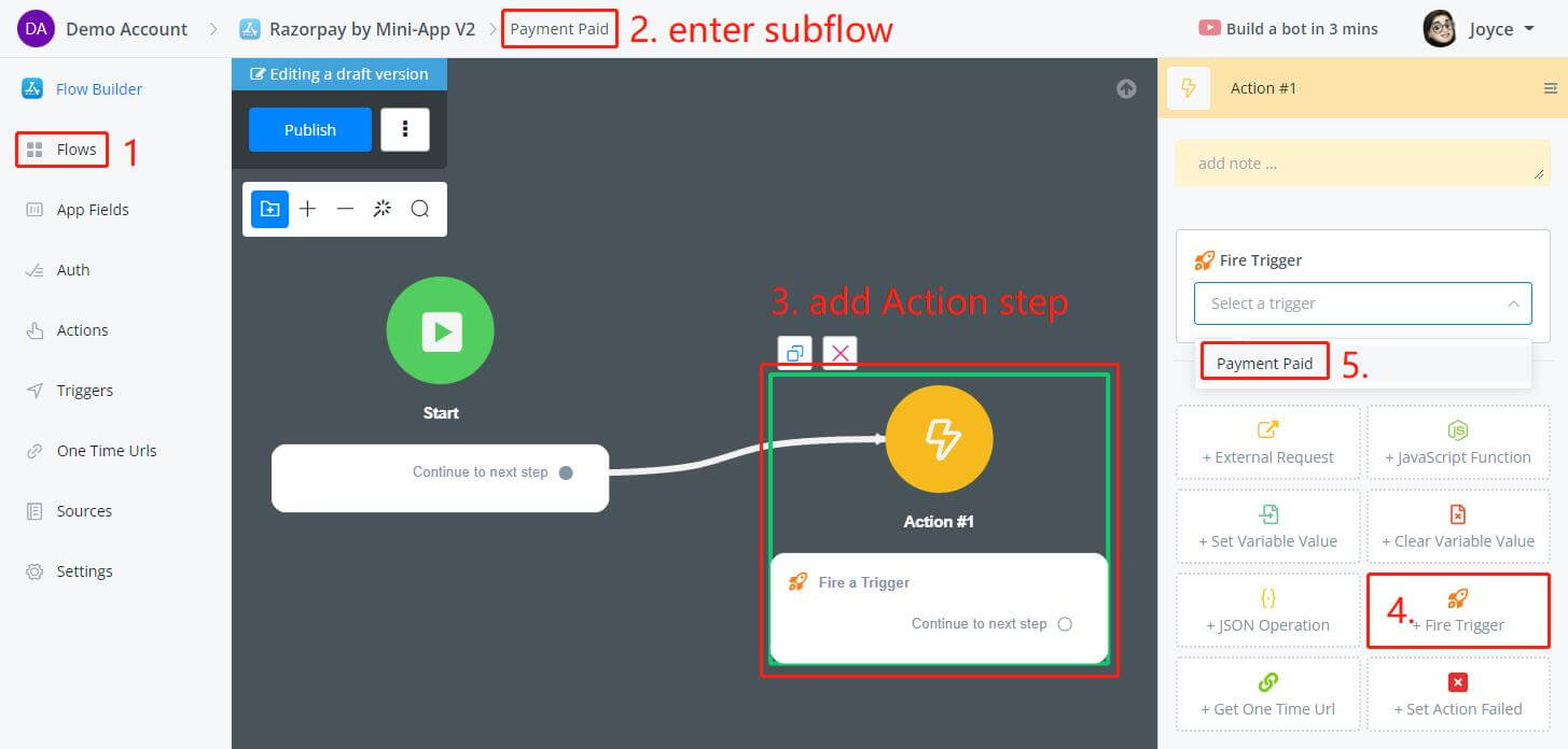 The app now can receive payment results from Razorpay, let's send the result back to the chatbot via a trigger.