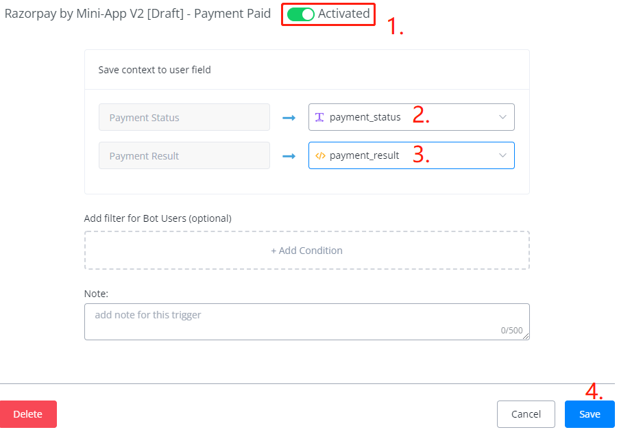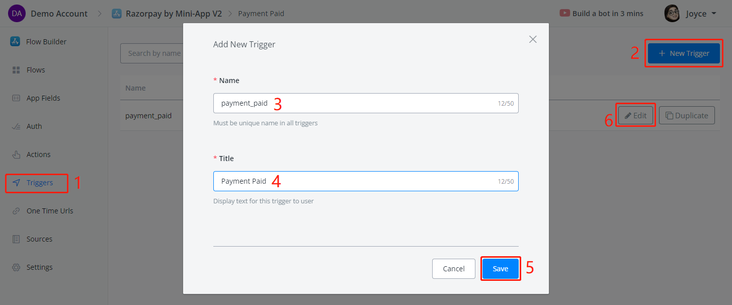 Follow steps 1 to 4 in the above screenshot to add the trigger and name 2 custom fields to save the data in the chatbot: