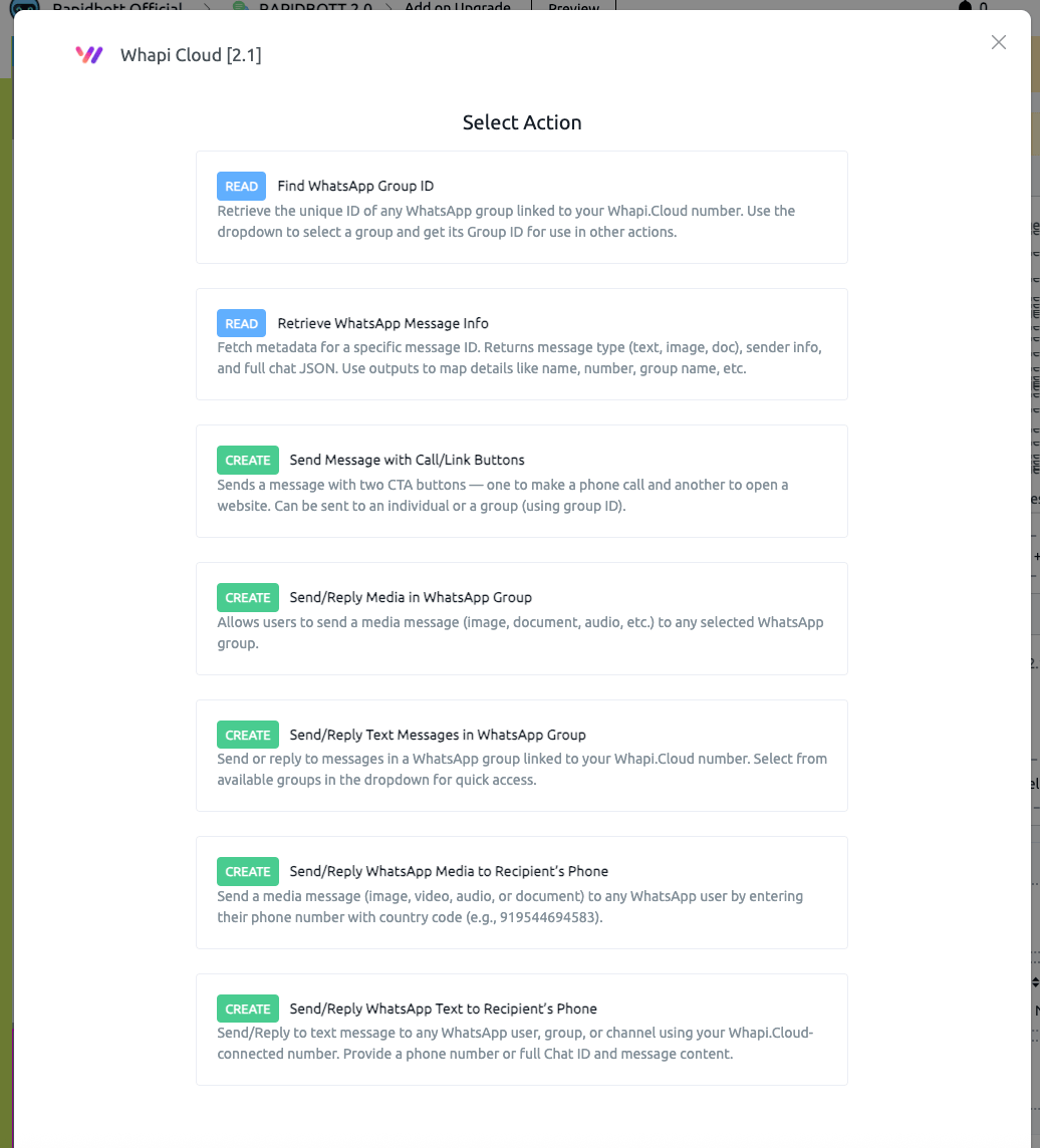 Easily send and receive WhatsApp messages, media, and group interactions using the Whapi.Cloud Mini App integrated with Rapidbott. This guide explains setup, API token configuration, and the details of each supported action.