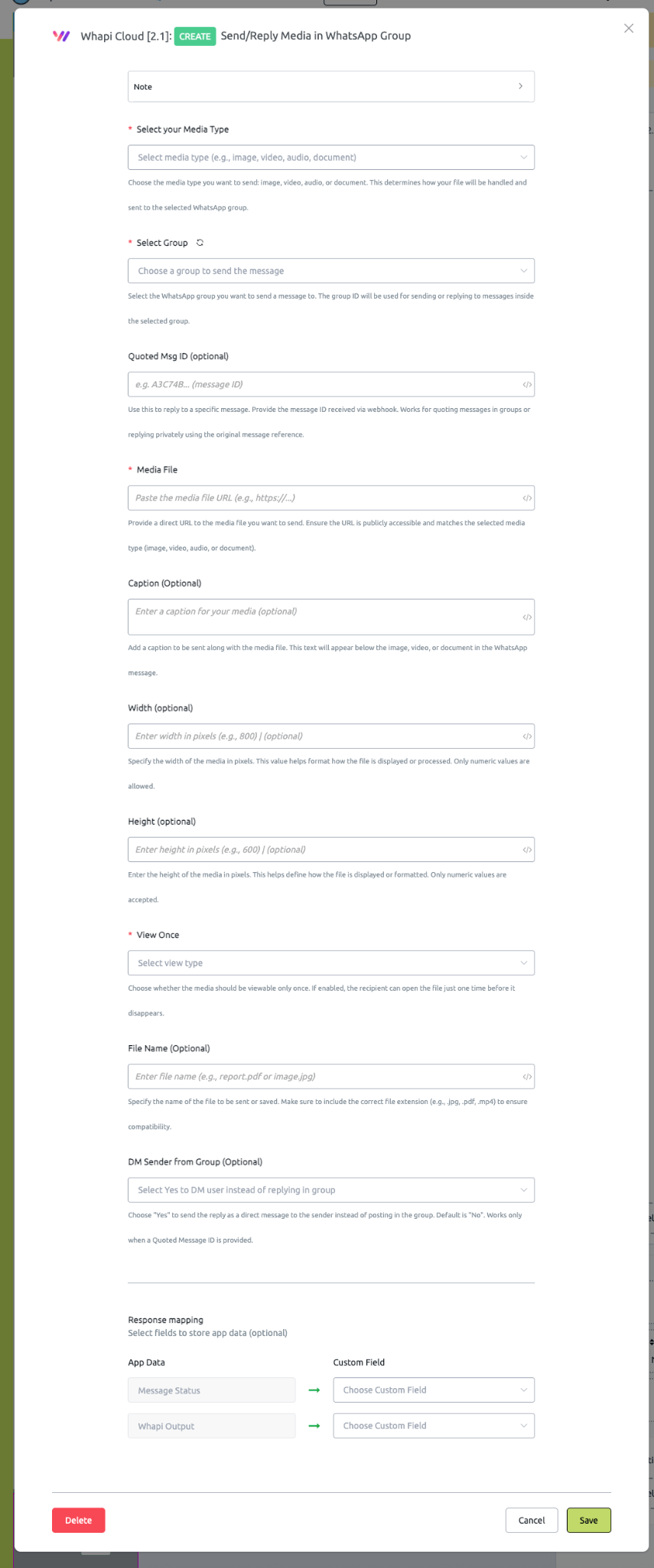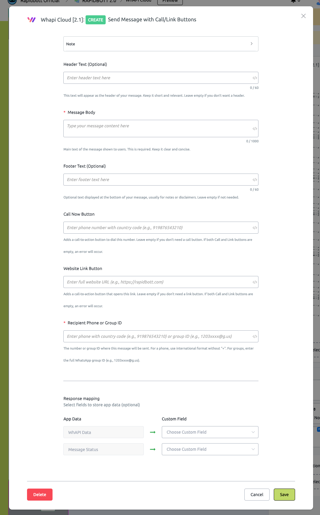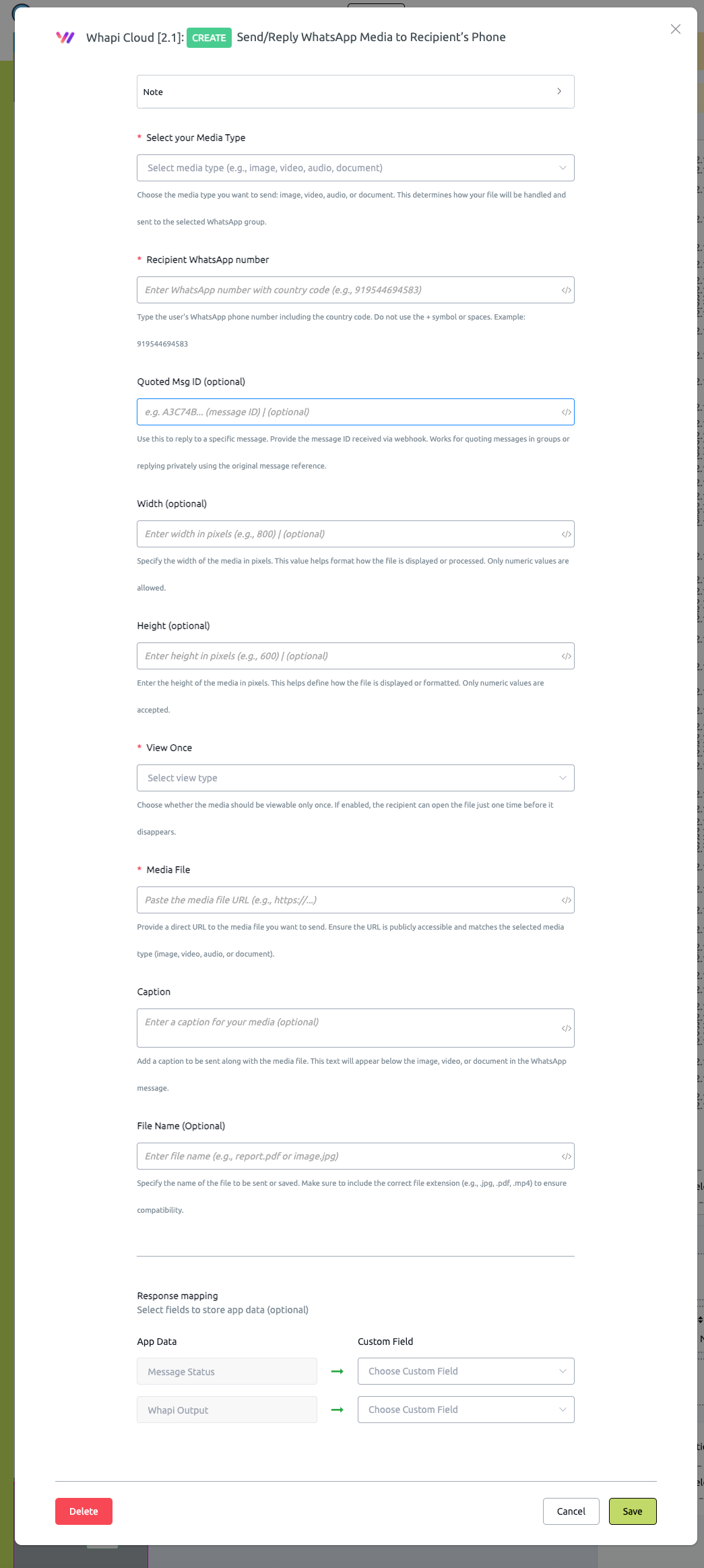 6. Optionally map **WhAPI Data** and **Message Status** into custom fields for later use.