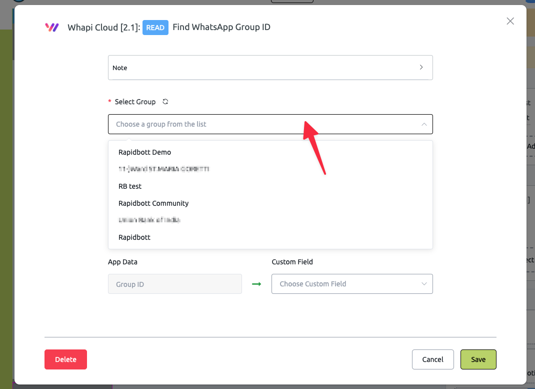 1. Select a group from the **dropdown list** of all groups linked to your Whapi cloud WhatsApp number.
