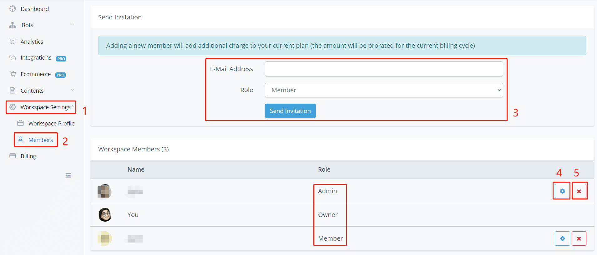 (Owner Only) Follow steps 1, 2 and 3 in the above screenshot to send out an invitation to a new member with his/her email address and role setting.