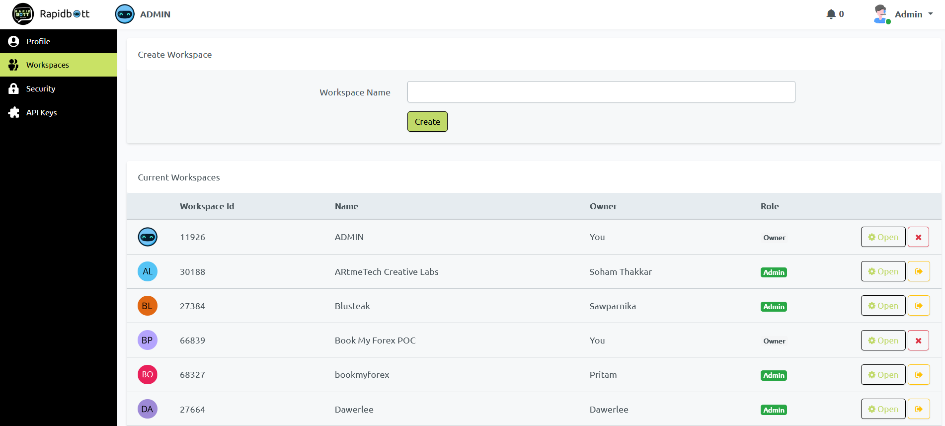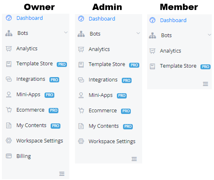 Each "Rapidbott account" is to be seen as a person/user. Members are all the people that have limited or full access to the workspace. There are 3 types of roles, **Owner, Admin and Member**.