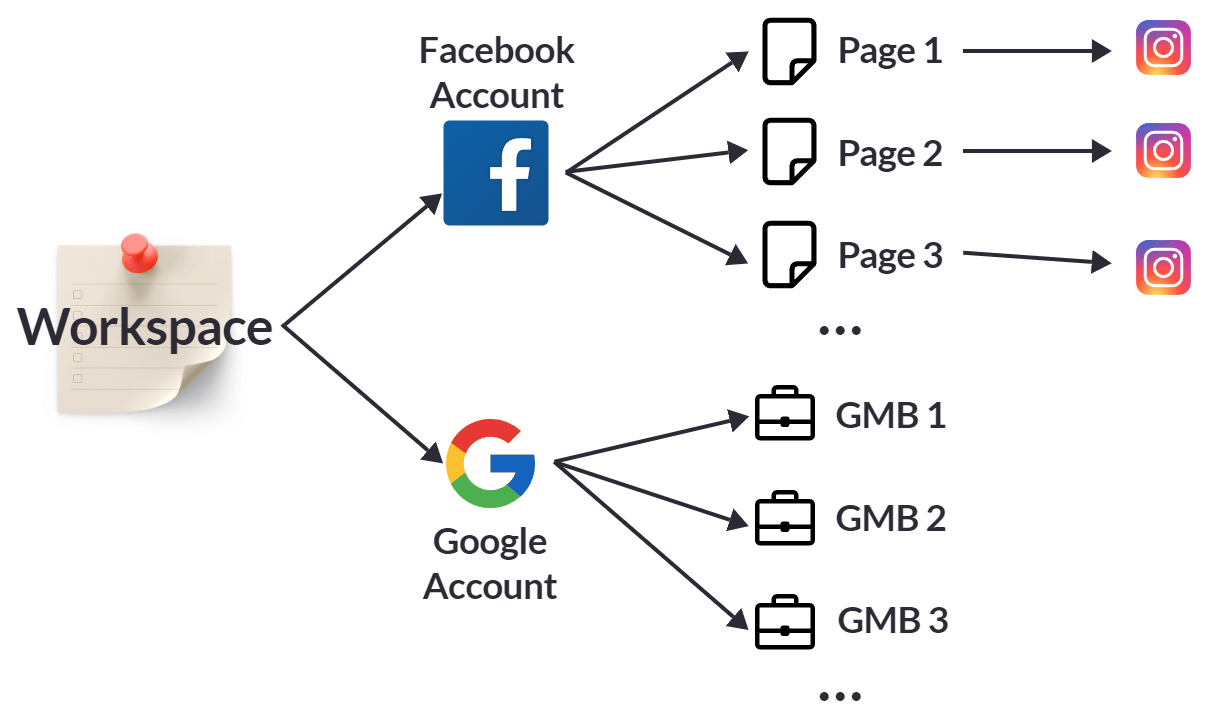 You are allowed to connect your workspace to only 1 Facebook/Google(for Google My Business) account but you can create bots for more than 1 Facebook Page / Google Business.
