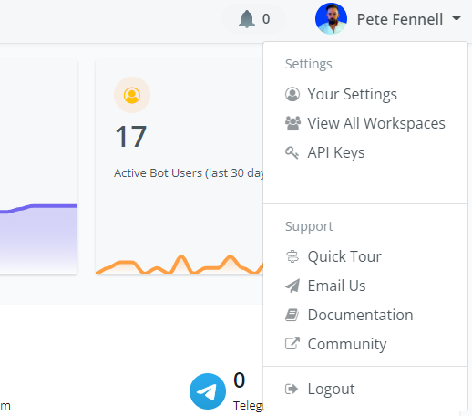 In the upper right corner, click your user name and "Your Settings". Moreover, you can find support links here. For example, try "Quick Tour" to get familiar with your dashboard!