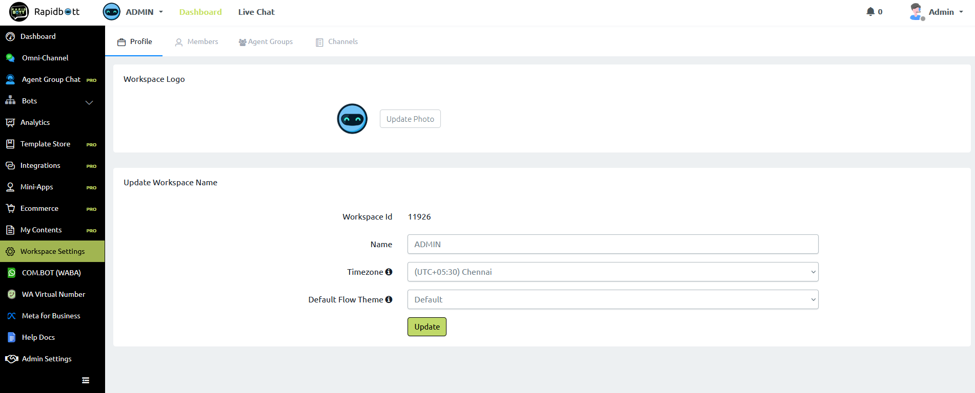 To edit the profile of your workspace, click **Workspace Settings** and **profile** in the above screenshot. You can change your logo, workspace name, timezone and default flow theme.